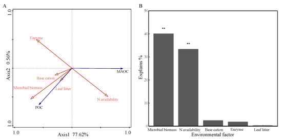 Redundancy analysis of soil environmental factors on POC and MAOC in Moso bamboo forests under nitrogen application. (A) shows the redundancy analysis, and (B) shows the degree of explanation of environmental factors. ** p < 0.01.
