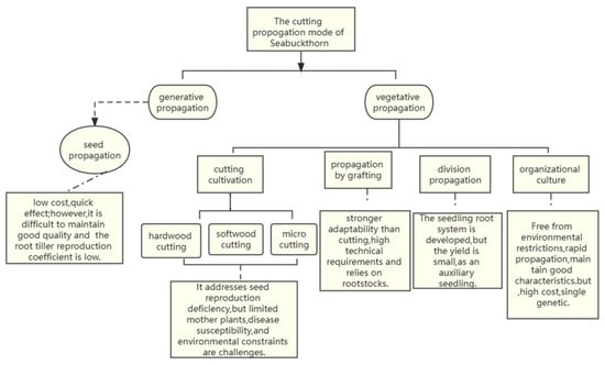With the discovery of Sea buckthorn’s nutritional and economic value, the demand for it has been steadily increasing. It is widely used in the fields of medicine, food, cosmetics, beverages, water conservation, and soil protection as part of afforestation efforts. Simultaneously, it has expedited the development of local agriculture. Therefore, there is a need for a detailed analysis of Sea buckthorn seedlings and afforestation techniques to enhance their survival rate. This is crucial for cultivating high-quality Sea buckthorn with high survival rates and for maximizing its ecological and economic value. Due to Sea buckthorn’s strong adaptability, conventional tree propagation methods can be applied to Sea buckthorn. Currently, there are two main methods of Sea buckthorn propagation: sexual reproduction and asexual reproduction. Each propagation method comes with unique advantages and disadvantages, as shown in Figure 2.