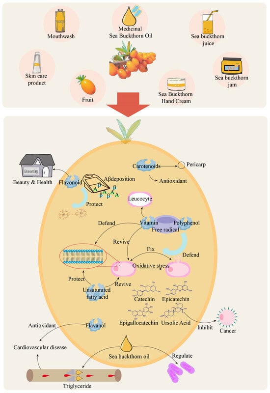 Sea buckthorn has many characteristics that are beneficial to human health, and its roots, stems, leaves, flowers, and fruits have good medicinal value potential. China has a long history of the medicinal use of Sea buckthorn, which has been widely used in the field of national medicine. It is a commonly used medicinal material for Tibetan medicine and Mongolian medicine. Many famous medical classics also record the medicinal efficacy of Sea buckthorn. It is a guiding theory of medication accumulated by ancient working people and medical experts through a large number of clinical practices for a long time, which plays an important guiding role in the mining of Sea buckthorn efficacy and product development. There are many metabolic pathways in the whole life cycle of Sea buckthorn. These metabolic pathways lead to the production of many secondary metabolites, which have certain medicinal value, such as flavonoids and phenolic acids. Studies have found that these components have a wide range of health benefits by exerting antioxidant, anticancer, anti-inflammatory, antibacterial, and antiviral effects, as well as protective effects on the cardiovascular system, skin, nerves, and liver. The extensive research by many scholars has focused on these bioactive compounds, which primarily function by neutralizing free radicals, inhibiting lipid peroxidation reactions, and activating antioxidant systems []. The nutritional and bioactive content of Sea buckthorn fruit influences its health value [].