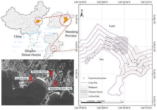 Samples were collected from three coastal green areas in the southern district of Qingdao: Luxun Park, Badaguan Scenic Area, and Huizhuan Square (Figure 1). They represent the three forms of coastal green space in Qingdao.