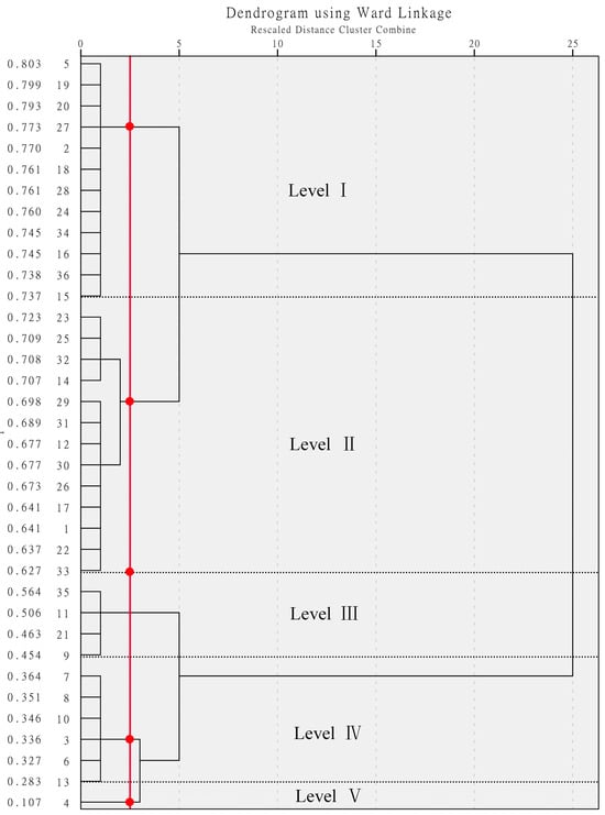 Drawing on the literature and practical imperatives, the CGHI values underwent systematic clustering that employed Ward’s method and squared Euclidean distance. CGHI is classified into four different classes using the red line as a reference line, as shown in Figure 2 [31]. The analysis elucidated the strength of comprehensive healthcare benefits within various numerical intervals. This resulted in the establishment of a grading standard for the comprehensive evaluation index of coastal green environmental healthcare benefits, as presented in Table 2.