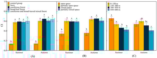 The CI for various landscape compositions, landscape configurations, and coastal distances in the coastal green space was determined using Equations (A1) and (A2) in Appendix B. This was used as the basis for evaluating negative air ion concentrations, and the evaluation criteria are shown in Table A1 in Appendix B. Analyzing landscape composition (Figure 3A), the summer CI peaks at coniferous and broadleaf mixed forest (0.601 ± 0.048), with a trough in the control groups (0.135 ± 0.018). In autumn, the coniferous forest boasts the highest values (0.645 ± 0.056), while the control groups maintain the lowest values (0.139 ± 0.021). Forests and grasslands in both seasons consistently meet or surpass Level III standards, highlighting positive health effects. Conversely, the control groups are relegated to Level V, lacking health benefits and falling short of human health needs.