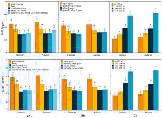 Comparison of airborne particulate matter concentration in different landscape compositions (A); landscape configurations (B); and coastal distances (C). The different lowercase letters indicate significant differences in landscape composition (p < 0.05).