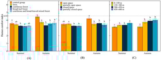 The human comfort index for diverse landscape compositions, landscape configurations, and coastal distances within coastal green spaces was computed utilizing Equation (A3), as presented in Appendix B. Subsequently, the obtained values were evaluated against the predefined assessment criteria outlined in Table A1 of Appendix B. The most elevated comfort levels were recorded in broadleaf forests during the summer and coniferous forests during autumn (Figure 5A). Among the different landscape configurations, the partially closed space provided the highest human comfort level during the summer and fall (Figure 5B). In terms of coastal distance, 0–150 m exhibited the highest level of human comfort during both the summer and autumn seasons (Figure 5C). All landscape configurations and coastal distances consistently met or exceeded comfort thresholds in summer and fall, yielding excellent health effects.