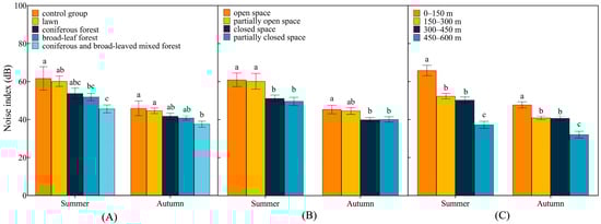 Following the acoustic environments index rating criteria in Table A1 of Appendix B, it is evident that, in summer, all landscape compositions, excluding coniferous and broadleaf mixed forests, are at Level III. Control groups and lawns exhibit noise levels exceeding 60 dB, significantly higher than coniferous forests and broadleaf forests. Coniferous and broadleaf mixed forests are classified at Level II, and are associated with positive health effects. Moving to autumn, most forests achieve a very quiet Level I, while lawn and control groups rise to a Level II rating, contributing to a favorable acoustic environment (Figure 6A).