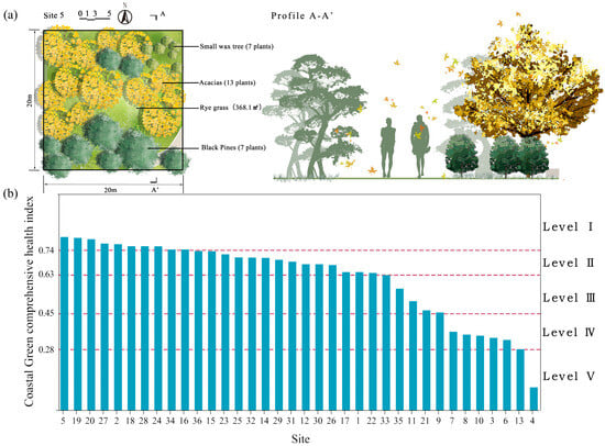 The normalized values of the five health indicators were obtained according to Equations (1) and (2) above. Meanwhile, the integrated health indices of coastal greenery were calculated and evaluated separately for each point and different landscape compositions, landscape configurations, and coastal distances according to Equation (5) and Table 2 and are shown in Figure 7. The CGHI values of each test site were ranked in descending order of magnitude, and the test site with the best overall health benefits was found to be Site 5, whose plant and altitude plots are shown in Figure 7. Please refer to Appendix C for detailed data.