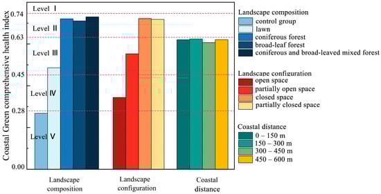 In Figure 8 below, according to the CGHI values, in terms of landscape composition, the forests all reached Level II with strong rehabilitative health benefits; the grasslands reached Level III with general health benefits; and the control groups were at Level V with no comprehensive health benefits. The order of integrated health effects of landscape compositions was as follows: coniferous and broadleaf mixed forest > coniferous forest > broadleaf forest > lawn > control groups.
