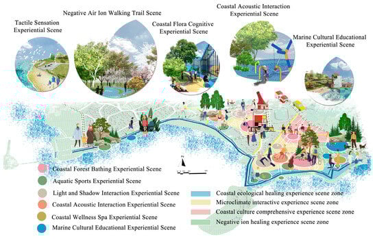 Despite considerable research on the therapeutic potential of coastal spaces, limited attention has been given to the influence of landscape elements in specific environments such as coastal green spaces. Grounded in scene theory and contextualized within the current site conditions, this study elucidates the health impact and distribution patterns of singular and comprehensive therapeutic elements. The research site is systematically delineated into four principal experiential domains, namely, the coastal ecological healing experience scene zone, negative ion healing experience scene zone, microclimate interactive experience scene zone, and coastal culture comprehensive experience scene zone (see Figure 9). The investigation concentrates on augmenting the functionality of coastal green spaces and strategically situating focal points in alignment with the concentrated dispersion of therapeutic factors. Within the microclimate interactive experience scenario, emphasis is placed on the discernment of natural textures and tactile sensations, judicious selection of plant varieties and hues, effective management of olfactory stimuli, and the integration of natural soundscapes along the coastal locale. Simultaneously, meticulous consideration is given to the dynamic qualities of light within the plant community to orchestrate a diverse sensory encounter within the coastal microclimate. In the negative ion healing experience scenario, deliberate attention is directed towards leveraging plant configurations to configure varied activity spaces, including O-shaped, U-shaped, L-shaped, and parallel spaces, thereby affording individuals a multitude of interaction possibilities (see Figure 10) [61]. Concurrently, the coastal ecological healing experience scene and the coastal culture comprehensive experience scene amalgamate nature education with water-based activities. The orchestration of an aesthetically pleasing visual space is achieved through the controlled elevation of billboards and structures within the coastal green space, harnessing the natural cooling attributes of the ocean to introduce sea breezes into the urban fabric. This strategic intervention establishes ventilation corridors, mitigating the intensity of summer heat within the cityscape [62]. Future landscape design should reinforce the restorative effects of the area through a judicious selection and configuration of landscape types, elements, and components.