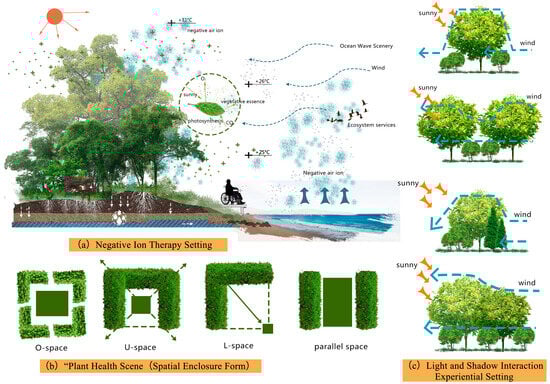 Conceptual diagram of coastal green space main scenes: (a) improve the structure of the vegetation community according to the distribution and concentration laws of healing factors, increase the application of recreational plants, and improve hydrophilicity and accessibility by combining the advantages of coastal geographic location and distance with the design of the trestle. At the same time, design ecological berms and rainwater infiltration planting ponds to improve groundwater quality and protect biodiversity; (b) use plants to enclose diversified activity spaces and categorize the design according to the needs of different people, such as a more private O-shaped space, a semi-closed U-shaped space, a semi-open L-shaped space, and an open parallel space; and (c) utilize the natural characteristics of the coastal microclimate, such as wind, light, and sound, combined with the plant enclosure space, to change the landscape light and shadow effect, and enhance the node interactivity and interest.
