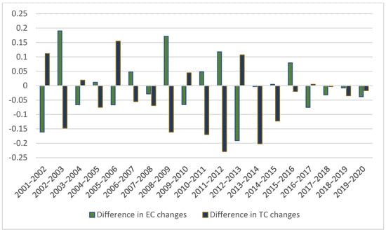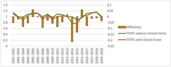 Figure 2 indicates the difference in forestry total factor productivity change after incorporating climate factors. Figure 3 further indicates the climate factor’s impact on EC and TC.