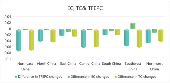 Moreover, the TFPC in North China, East China, and South China also declined due to climate factors; however, it did not decline below 1. Figure 4 indicates the TFPC, EC, and TC decline of all seven regions after incorporating the climate factor. However, a slight growth of EC was witnessed in the South China region. The main culprit in the deterioration of TFPC was TC, which declined due to the climate factors included in the production function. Figure 5 further displays the difference between all seven regions’ gauged TFPC, EC, and TC with and without climate factors.