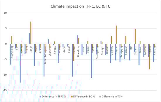 Differences in TFPC, EC, and TC due to climate factor incorporation.