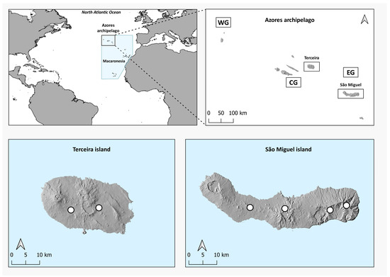 Map of the Azores archipelago (WG—Western Group, CG—Central Group, and EG—Eastern Group), framed on the North Atlantic Ocean and, more specifically, in Macaronesia. Both islands included in the study (Terceira and São Miguel) are highlighted, and circles indicate Laurus azorica sampled sites.