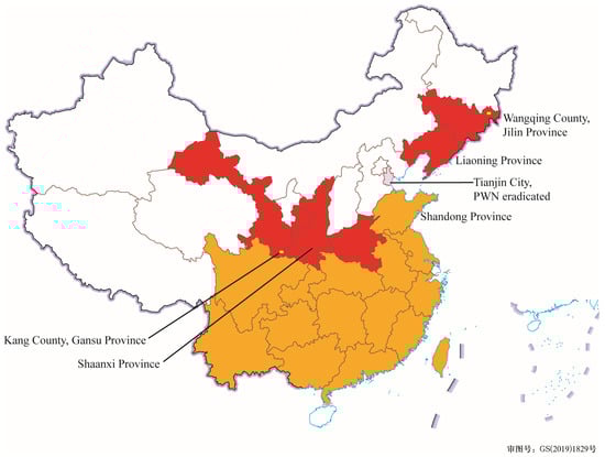 - General Station of Forest and Grassland Pest Control of National Forestry and Grassland Administration; Nanjing Forestry University. Occurrence Regularity and Control Techniques of Pine Wilt Disease in China; China Forestry Publishing House: Beijing, China, 2019. (In Chinese) [Google Scholar]