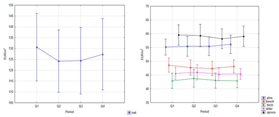 −3, CV = 25%); the lowest oak wood prices were found in Q2 (124.20 € m