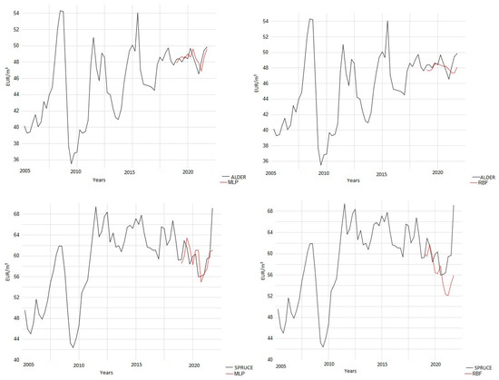 RBF forecasts for beech wood were inferior to MLP forecasts (the former overestimated the initial quarters and underestimated the subsequent ones), but their predictions for the last quarter were the most accurate, identical to the actual values. The MLP model had the best RMSE and MAE metrics and indicated a price increase in the last quarter (but it still underestimated the magnitude of the increase).
