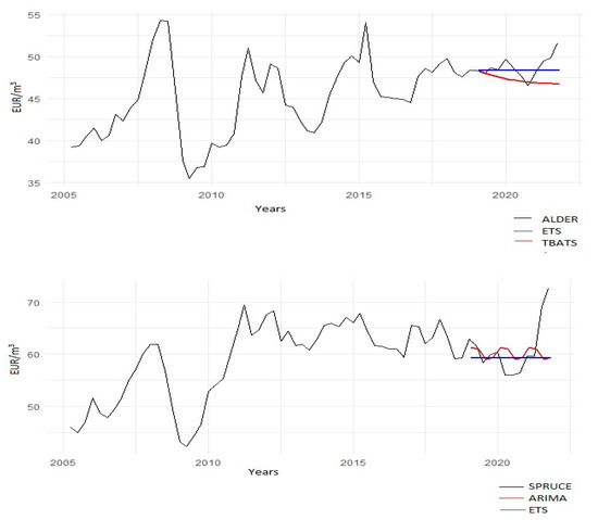 BATS and TBATS produced good forecasts for birch and alder roundwood, which were characterized by very low MAE and RMSE (especially in the case of birch wood).
