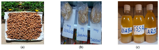 Sampling and extraction of argan oil from the plantation and two natural forest stands of argan trees. (a) Argan nuts from a plantation in Casablanca. (b) Composite samples of argan kernels collected from the three sampling sites (Essaouira, Casablanca, and Taroudant). (c) Argan oil extracted by cold mechanical pressure.