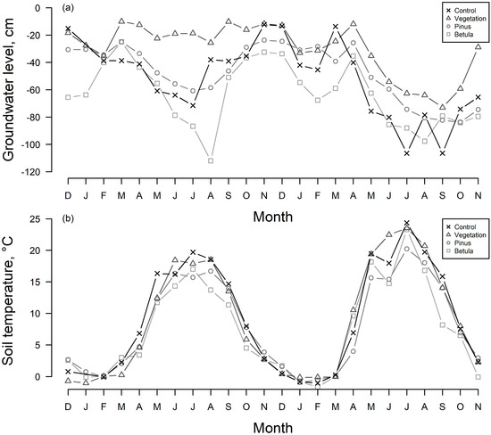 The after-use management practices of former peat extraction fields may be very diverse in terms of climate change mitigation targets: firstly with carbon sequestration capacity, secondly with impact on climate and nature (soil emission magnitude) and thirdly with establishment costs and economic viability. The average soil temperature in the analyzed study sites differed significantly between afforested sites (Pinus and Betula) and sites without tree cover (control and vegetation) (Figure 1b), due to tree canopy cover that reduced the solar radiation’s influence on the soil temperature [29]. Furthermore, groundwater level differences between sites were notable (Figure 1a). The highest groundwater level was observed for the vegetation field, where no ditch (drainage) system had been established, but the groundwater level on all other fields fluctuated throughout the measurement campaign. The peat chemical content also significantly differed between the land use types (Table 2).