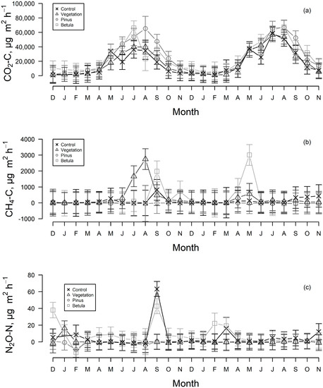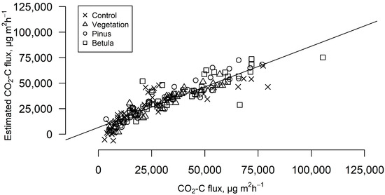 CO2 emissions were expressed as heterotrophic soil respiration (to exclude ground vegetation impact on emissions) by multiplying the total soil CO2 flux of vegetation, Pinus and Betula fields with the heterotrophic respiration coefficient (43% of the total respiration) presented by Berglund et al. [26]. Later in the analysis, only the heterotrophic soil CO2 flux was used.