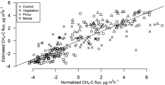 The linear mixed-effect model’s estimated and normalized (actual) CH4-C flux.
