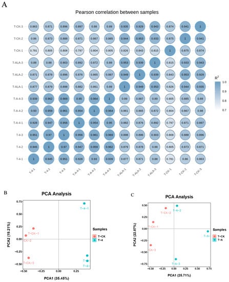Subsequently, to investigate the global effect of low temperature and ALA spraying treatments on the transcriptomic patterns of tea plants, two algorithms including correlation analysis and principal component analysis (PCA) were further implemented based on the transcriptomic profiles of three experimental treatments (T-4, T-A and T-A-4) (Figure 1). The correlation analysis results displayed obvious distinctions among the comparisons of T-CK vs. T-4, T-CK vs. T-A and T-4 vs. T-A-4, respectively, by means of Pearson algorithm (Figure 1A). It suggested that low-temperature treatment including T-4 and T-A-4 treatments caused more significant variations in transcriptomic patterns of tea plants than that of T-A and T-CK treatment. Further PCA analysis reached a consensus with the correlation analysis that all transcripts exhibited conspicuous distinction with the variance of 35.45% in PC1, 25.71% in PC1 and 22.76% in PC2 under T-CK vs. T-4, T-CK vs. T-A and T-A-4 vs. T-4 comparisons (Figure 1B–D). This PCA analysis supported the result that low-temperature treatments caused more transcriptomic variations of tea plants than the T-A treatment did.
