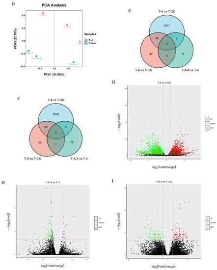 Landscape of the transcriptomic patterns of tea leaves after T-4, T-A and T-A-4 treatments. (A): Correlation analysis on all samples depicting two distinct clades: samples of T-CK with T-A and T-4 with T-A-4. (B–D) Principle component analysis (PCA) on the transcriptomic profiles of tea leaves after T-4, T-A, T-A-4 treatments compared with untreated control. Four regions within 95% confidence intervals were formed in the PCA plots. (E,F) Venn diagram of up-regulated and down-regulated genes in T-A vs. T-CK, T-4 vs. T-CK and T-A-4 vs. T-4 pairwise comparisons. (G–I) Volcano plots illustrated the differentially expression genes in T-4 vs. T-CK, T-A-4 vs. T-4 and T-ALA vs. T-CK pairwise comparisons. The up-regulated and down-regulated genes were exhibited in red and green, respectively, whereas black dots showed no significant genes in each comparison.