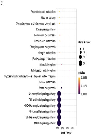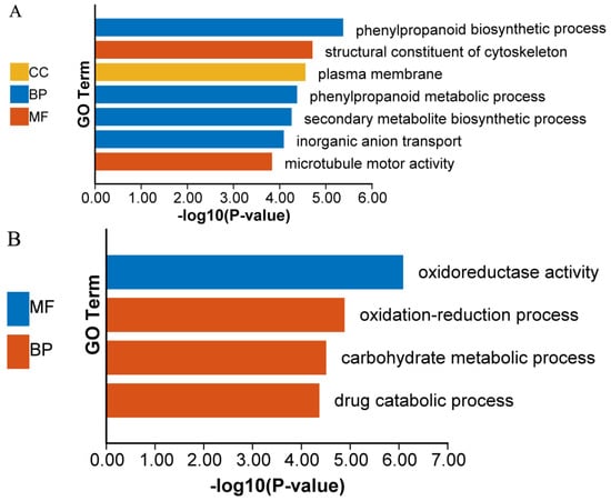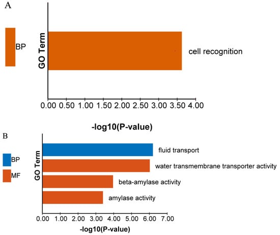 Subsequently, 294 down-regulated DEGs were involved in 35 GO categories with 4 significant GO terms (FDR < 0.05), including fluid transport (3 genes), water transmembrane transporter activity (3 genes), beta-amylase activity (2 genes) and amylase activity (2 genes) (Figure 3B). Genes involved in fluid transport and water transmembrane transporter activity in BP and MF category, respectively, were mainly enriched. Further KEGG analysis also suggested that down-regulated DEGs had a large proportion in the MAPK signaling pathway and biosynthesis of secondary metabolites (Figure 3D). Thus, T-A treatment mainly affected the transcription patterns of transport process, including fluid transport and water transmembrane, allowing for the promotion of efficient transport of cytoplasmic inclusions.