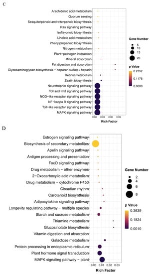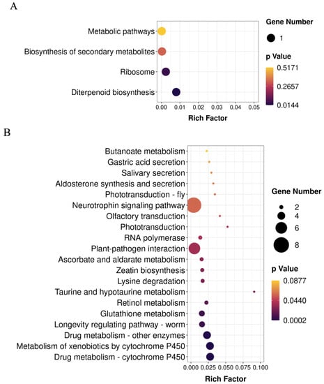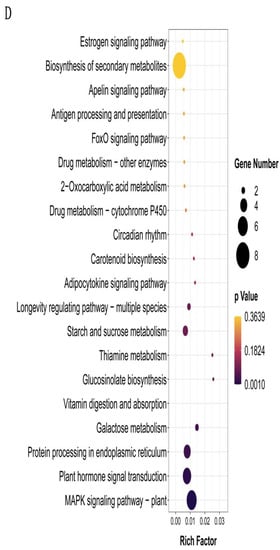 In the comparison of T-A-4 with T-4, we found that a small proportion of gene expression in the transcriptome was up-regulated with a presentation of heatmap (Figure 4C). In addition, all up-regulated DEGs were mainly enriched in diterpenoid biosynthesis, metabolic pathway and ribosome (Figure 4A). Terpenoids are the most abundant and diverse secondary metabolites reported at present. They play an important role in plant development and stress resistance. Plant alcohols, vitamin A and gibberellin are important representatives of diterpenoids in plants. They are essential for plants to resist various biotic and abiotic stresses. Furthermore, many down-regulated DEGs relevant to pathways in drug metabolism-cytochrome P450, other enzymes and the metabolism of xenobiotics by cytochrome P450 and glutathione metabolism were enriched (Figure 4B).