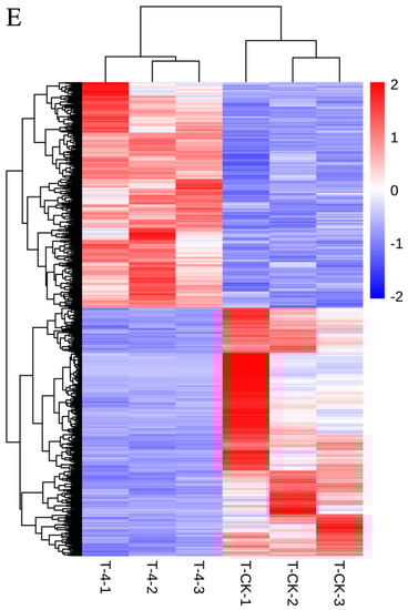 GO and KEGG enrichment analysis on the significant differential genes in T-4 vs. T-CK comparison. (A,C) Gene ontology enrichment analysis on up-regulated and down-regulated differential genes respectively in T-4 vs. T-CK comparison. DEGs were divided into biological process, cellular component and molecular function distinguished with the different adjusted P-value of each GO terms shown in vertical coordinate represented. (B,D) KEGG pathway enrichment analysis on up-regulated and down-regulated genes respectively upon T-4 treatment. (E) The expression profiles of all DEGs involved in the comparison of T-4 vs. T-CK. The red color displays up-regulated DEGs and blue color displays down-regulated DEGs in heatmap.