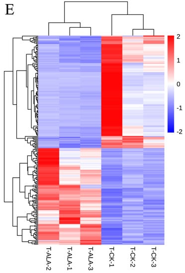 At present, the utilization of plant growth regulator has been deemed to be an efficient approach to alleviate the effects of chilling injury to plants. ALA is a biological source of porphyrins as well as the key precursor of chlorophyll and heme and plays a pivotal role in enhancing plant stress resistance, relieving stress damage, and improving the plant physiological characteristics [,]. It has been reported that ALA may improve the yield and quality of tea by increasing the photosynthetic capacity and antioxidant capacity of leaves []. We also observed the promoting effect of ALA in our study, as shown in Figure 2, with the comparison of T-A and T-CK. Additionally, we found that, after ALA treatment, the synthesis of flavonoids in genes related to tea plant organization and pathways of gene expression increase to a certain degree. Studies have shown that an increase in the flavonoid content of flavonoids can improve the tea flavor and taste, and some flavor substances, such as such as catechins, theanine, tea polyphenols and tea polysaccharide need flavonoids as the substrate [].