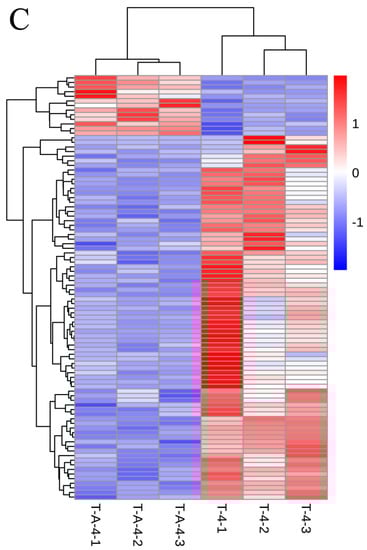 KEGG enrichment analysis of DEGs and their expression involved in the comparison of T-A-4 vs. T-4. (A,B) KEGG pathway enrichment analysis on up-regulated and down-regulated DEGs showed the distribution of metabolic pathways in pairwise comparison of T-A-4 vs. T-4 treatment. (C) The expression profiles of DEGs related to pairwise comparison of T-A-4 vs. T-4 treatment. The up-regulated DEGs were marked in red color, and down-regulated DEGs were marked in blue color in heatmap.
