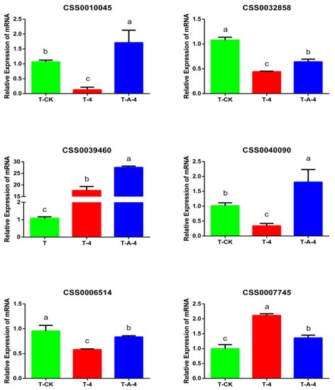 To verify the authentic transcripts levels of associated genes, 6 genes with differentially expressed transcriptomic profiles were chosen to perform qRT-PCR assays (Figure 5). The qRT-PCR result of 6 DEGs was basically in agreement with the RNA-seq results; CSS0010045 (XP_028088706.1), CSS0039460 (AUD40403.1) and CSS0040090 (XP_028085703.1) were up-regulated under T-A-4 treatment compared to under T-4 treatment. We found the expression of CSS0010045 and CSS0040090 were down-regulated in T-4 treatment and up-regulated in T-A-4 treatment. These genes were closely implicated with flavonol glycoside biosynthesis and oxidation-reduction process that were annotated as UGT and GST, respectively. GST was the master gene of the regulation of redox. Increasing evidence supports that GSTs not only can resist oxidation and relieve heavy metal toxicity, but it can also bind intracellular secondary metabolites, such as anthocyanins and plant hormones, and transport them to their corresponding positions so they can fulfil their roles. CSS0039460 and CSS0077455 (ASU87437.1) were up-regulated in T-4 treatment and T-A-4 treatment. Interestingly, we also noticed that CSS0039460 involved in inactivation activity of GAs was increased with a 28-fold upregulation in T-A-4 treatment, higher than that in T-4 treatment. In contrast, CSS007745 involved in flavonol synthesis was increased with a 2.2-fold up-regulation in T-4 treatment, higher than that in T-A-4 treatment. CSS03285 (XP_028108389.1) and CSS006514 (XP_028059482.1) were relatively up-regulated in T-A-4 treatment compared with T-4 treatment. They, respectively, were closely associated with photosynthesis and proline accumulation in tea plants, which suggested that exogenous application of 5-ALA made an important difference for the resilience of tea plants subjected to low temperature.