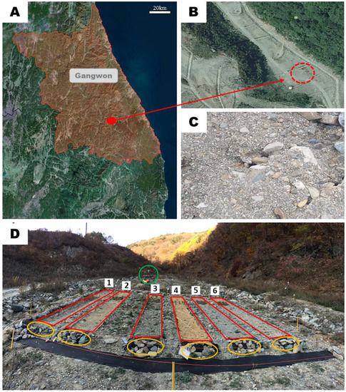 The Republic of Korea is topographically stretched from north to south, surrounded by the sea on three sides, and forests cover approximately 65% of the country. The southern slopes of the forest, in particular, are characterized by prolonged periods of sunshine, shallow soil depth, dehydrated soil conditions, and frequent soil erosion due to concentrated summer rainfall [24]. The study site is a deforested area on the southern slope where the existing vegetation has already vanished. The slope and soil hardness was adjusted to 11–14°, and 20 mm, respectively. If the soil hardness is high, the penetration of rainwater into the soil may be hindered and erosion and runoff from the soil surface may increase [25]. Regarding root system development, soil hardness of 23 mm or more often impedes root growth, and it has been found that stable growth can be observed between 11 and 20 mm [26]. Especially, this site is a mountainous area located at an altitude of 620 m above sea level, with frequent loss of soil due to snowfall in winter and strong winds blowing from the mountainside.