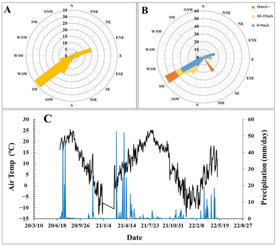 The number of wind directions (A), windrose diagram (B), air temperature (C; black line), and daily precipitation (C; blue line) during the experimental period.