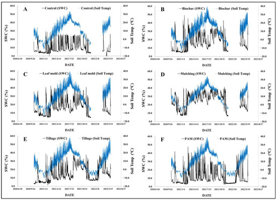 Soil water contents (SWC) and soil temperature (Soil Temp) of study plots (control (A), Biochar (B), Leaf-mold (C), Mulching (D), Tillage (E), and PAM (F)).