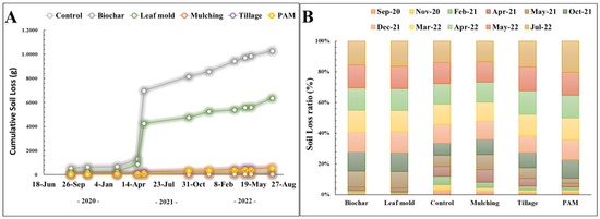 Cumulative soil loss (A) and soil loss ratio (B) of study plots during the experimental period.
