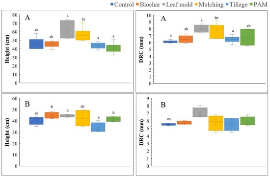 Growth characteristics of Pinus densiflora (A) and Larix kaempferi (B) under six different planting groundwork treatments. Different letters indicate significant differences (p < 0.05) by DMRT at a 5% level. ns: non-significance.