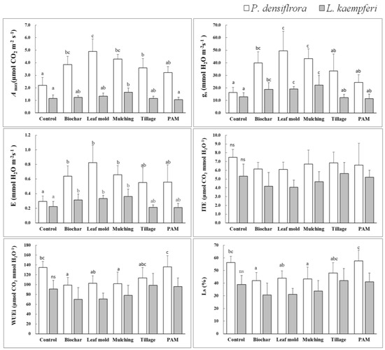 Effects of soil treatments on photosynthetic characteristics of P. densiflora and L. kaempferi under six different planting groundwork treatments. Bars represent means ± SD and different letters indicate significant differences (p < 0.05) by DMRT at a 5% level. ns: non-significance.