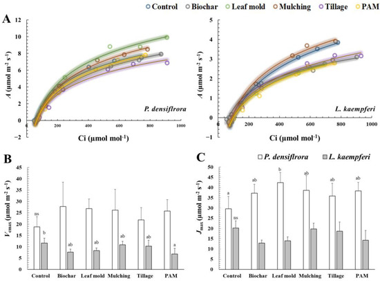 Effects of soil treatments on A-Ci curves (A), maximum carboxylation rate (B) and maximum electron transport rate (C) of P. densiflora and L. kaempferi under six different planting groundwork treatments. Bars represent means ± SD and different letters indicate significant differences (p < 0.05) by DMRT at a 5% level. ns: non-significance.