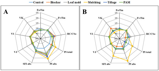 Radar plots of several chlorophyll fluorescence parameters of P. densiflora (A) and L. kaempferi (B) under six different planting groundwork treatments. The data are shown as a percentage of control.