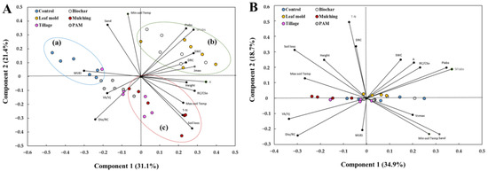 Figure 9 represents the Principle Component Analysis of the experimented two species. Firstly, Pinus densiflora can be divided into three groups; (a) the control, (b) the mulching and biochar, (c) the leaf mold, and PAM and tillage were applied to both A and B. The PC 1 axis can distinguish between groups A, B, and C and it has an explanatory power of approximately 31.1%. Among the representative factors affecting the PC axis 1, the environmental factors are soil moisture contents (SWC), maximum soil temperature (Max Temp.), maximum photosynthetic rate (A), height, maximum electron transfer rate (Jmax), root diameter, RC/Cso, intrinsic water use efficiency (WUEi). Environmental factors such as soil moisture contents (SWC), maximum soil temperature (Max Temp.), maximum photosynthetic rate (A), height, maximum electron transfer rate (Jmax), root diameter, RC/Cso, intrinsic water use efficiency (WUEi) are among the representative factors influencing the PC axis 1. Furthermore, groups B and A, and C can be divided into PC 2 axis, the representative factor is the minimum soil temperature (Min Temp.).