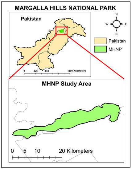 Geographically, the Margalla Hills National Park (MHNP) is located at the north end of Islamabad. Figure 1 shows the area of the MHNP in Pakistan’s Map. The geographic coordinates of MHNP are 33.0° 36′′ to 36.0° 33′′ N latitude and 72.0° 50′′ to 73.0° 26′′ E longitude. The Margalla Hills, with 465–1600 m elevation, have mainly limestone rocks. Many streams are found at MHNP, providing fresh water to local wildlife and habitants [45]. The MHNP has a humid subtropical climate [20]. Moreover, the Margalla Hills have a wide range of plant biodiversity [45]. For example, Phulai (Acacia modesta), Kao (Olea ferruginea), Sanatha (Dodonaea viscosa), Granda (Carissa spinarum), Ber (Zizyphus jujuba), and Lantana (Lantana camara) are the main tree species found in the region [46]. The Margalla Hills provide various opportunities for recreational facilities. There are almost 30 villages in the MHNP zone with a population of around seventy thousand [47]. The local community has been living here for several decades and practice a traditional lifestyle. In the case of deforestation and forest degradation, the drivers could be infrastructure-building, urbanization, mining, fuel-wood collection, fires, livestock grazing, and timber logging [48].