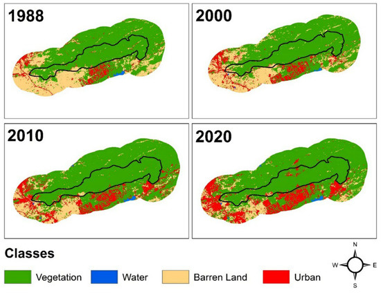 Figure 3 shows classified images for visual interpretation in 1988, 2000, 2010, and 2020. A significant change in land use has been observed in the last 32 years. Vegetation has slightly improved while urban areas have shown a notable increase from 1988 to 2020. The forest cover within the MHNP boundary area slightly increased from 136 km2 in 1988 to 138.2 km2 in 2020. The total forest cover gain in 32 years is almost 2.2 km2 (1.6%) in the MHNP boundary. Moreover, urban areas inside the MHNP boundary area increased from 4.5 km2 in 1988 to 8 km2 in 2020.