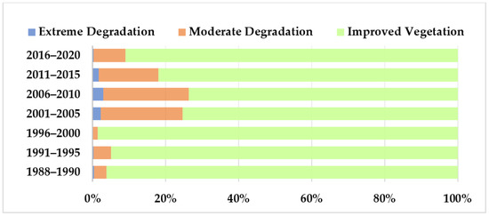 The VCI value of each pixel ranges from 0 to 100 (%). It is classified in three categories (Table 1), and the methodology is adopted from drought monitoring classification [59,60]. The area of extreme and moderate degradation was calculated for each interval.