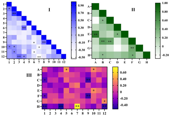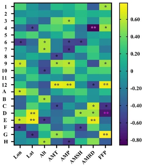 | Infructescence total flavonoid content | −0.290 | −0.518 * | 0.256 | 0.329 | 0.069 | −0.254 | −0.860 ** | 0.530 * |