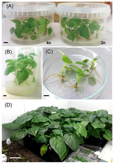 Tamarillo plantlets regenerated in vitro (Figure 1A–C) were successfully acclimatized in the climatic chamber (100% survival). After 8 weeks, the regenerated plants looked healthy and uniform in growth (Figure 1D), with no visible differences between diploid and tetraploid plants.