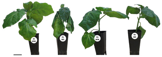 Representative plants of the different treatment groups defined for the water stress experiment: diploid well-watered (2n WW) and water-stressed (2n WS) plants; tetraploid well-watered (4n WW) and water-stressed (4n WS) plants (bar = 10 cm).