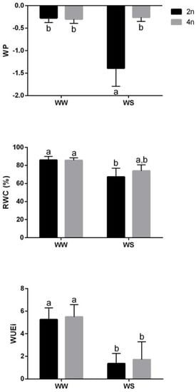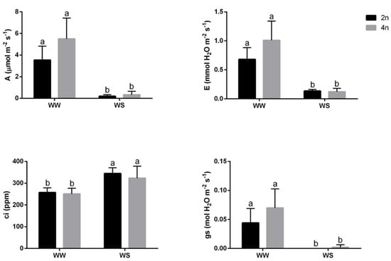 For intracellular CO2 concentration (Figure 4), even though no significant differences were registered between 2n and 4n plants, there were significant differences between the WW and WS groups. WS plants showed significantly higher intracellular CO2 contents.
