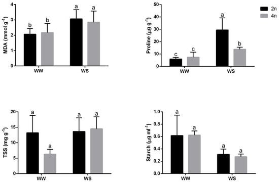 Effects of water stress (WS) on MDA, proline, total soluble sugars (TSS) and starch contents in diploid (2n) and tetraploid (4n) acclimatized tamarillo plants in comparison with well-watered (WW) plants. Means ± SDs, n = 6, different letters indicate significant differences between treatments at p ≤ 0.05.